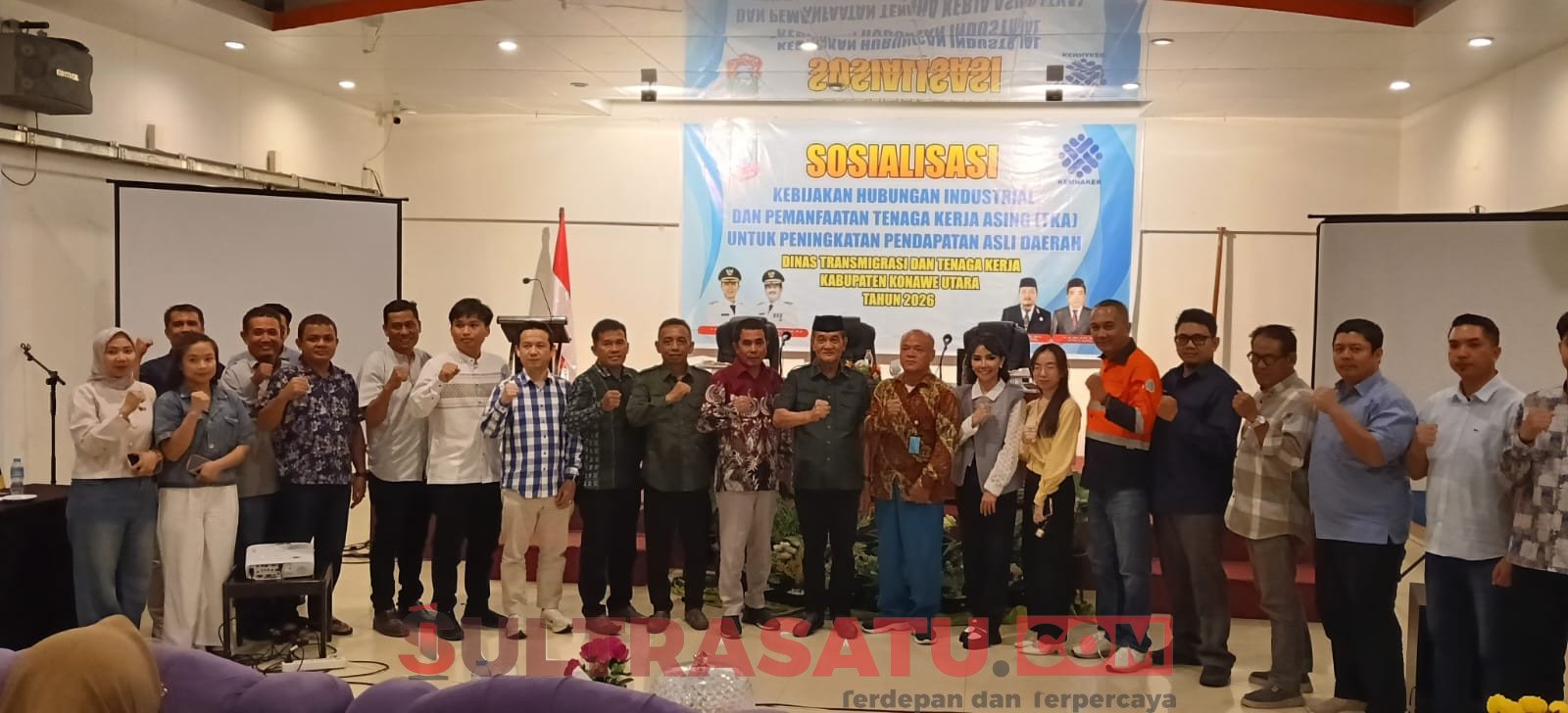 KONAWE UTARA, SULTRASATU.COM – Wakil Bupati Konawe Utara, H. Abuhaera, S.Sos.,M.Si mewakili Bupati Konawe Utara H. Ikbar, SH.,MH secara resmi membuka kegiatan Sosialisasi Kebijakan Hubungan Industrial dan Pemanfaatan Tenaga Kerja Asing (TKA) dalam rangka peningkatan Pendapatan Asli Daerah (PAD), Jumat (10/4/2026).