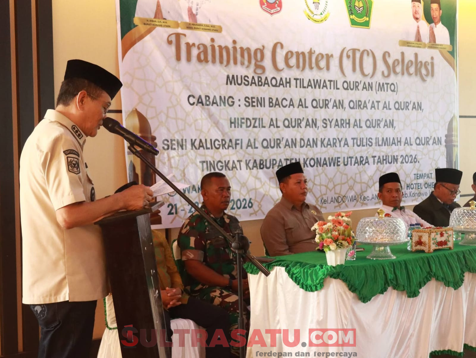 KONAWE UTARA, SULTRASATU.COM – Wakil Bupati Konawe Utara (Wabup) H. Abuhaera, S.Sos., M.Si., membuka Training Center (TC) Seleksi Musabaqoh Tilawatil Qur’an (MTQ) tingkat kabupaten, guna mempersiapkan kafilah menghadapi MTQ tingkat Provinsi Sulawesi Tenggara di Kabupaten Konawe, bertempat di Aula Hotel Oheo, Selasa (21/4/2026).