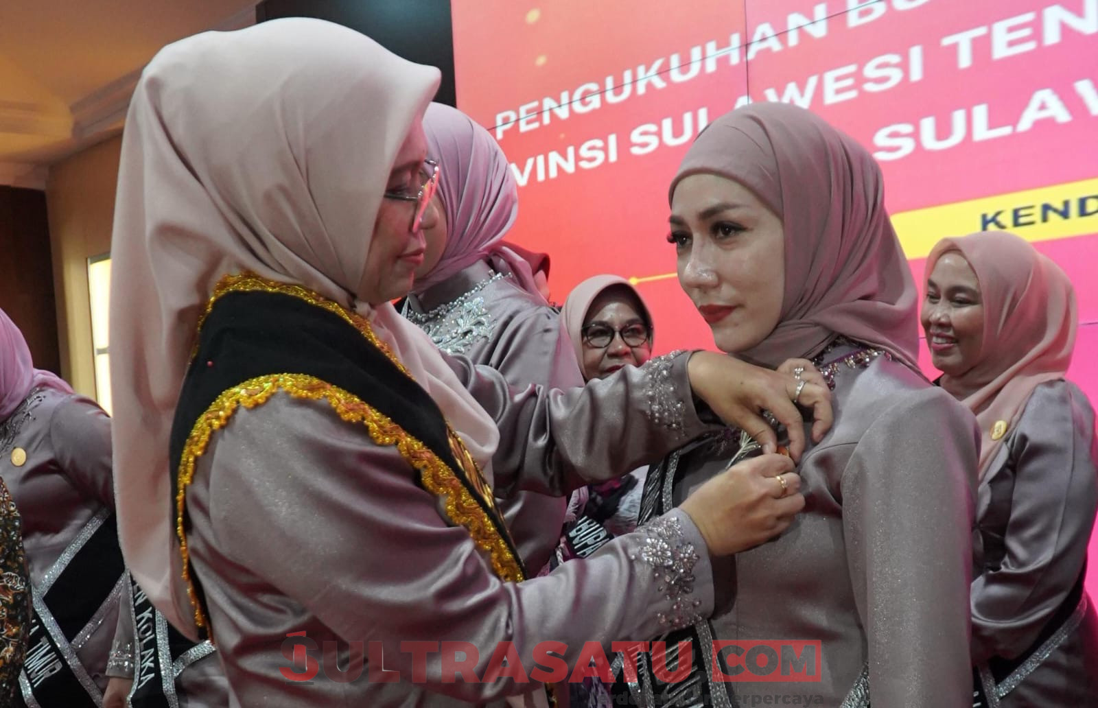 Bunda PAUD Sulawesi Tenggara, Ny. Arinta Nila Hapsari, menyematkan pin sebagai tanda dilantiknya Hj. Wisra Wastawati Ikbar, S.Tr.Keb sebagai Bunda PAUD Konawe Utara, di Aula Merah Putih Rujab Gubernur Sulawesi Tenggara, Jumat (25/7/2025).