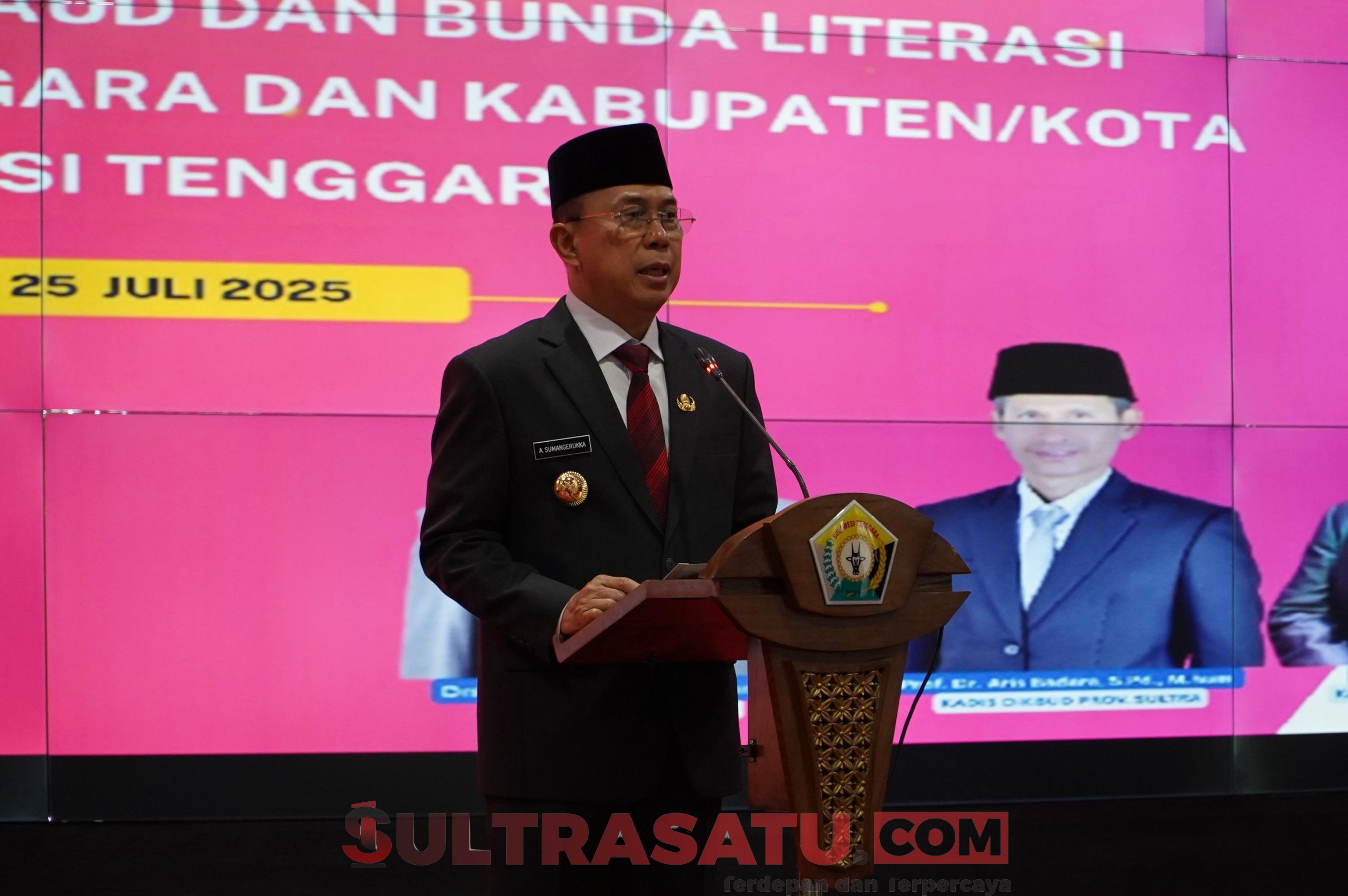 Gubernur Sulawesi Tenggara, Andi Sumangerukka menyampaikan sambutan pada pelantikan Bunda PAUD dan Bunda Literasi kabupaten/kota se-Sultra, Jumat (25/7/2025).