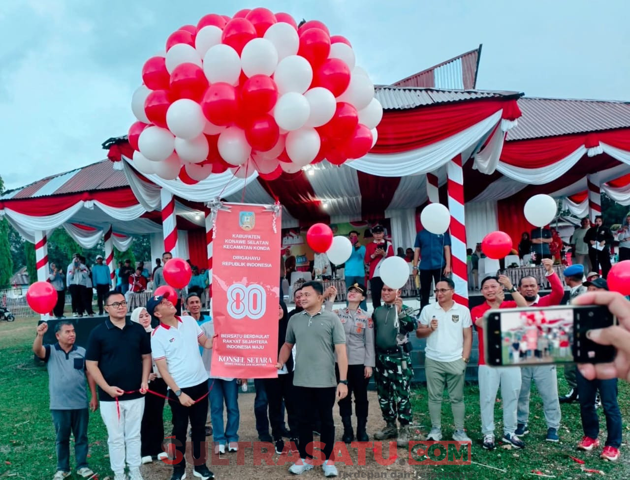 Bupati dan Walil Bupati Konawe Selatan melepaskan balon bertuliskan “Dirgahayu ke-80 RI dan Konsel Setara” ke angkasa menandai dibukanya Porseni HUT ke-80 RI di Kecamatan Konda.