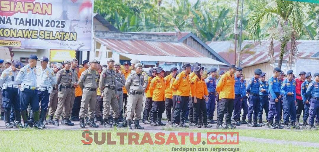 KONAWE SELATAN, SULTRASATU.COM – Pemerintah Kab.Konawe Selatan melalui Wakil Bupati Konawe Selatan menghadiri kegiatan Apel Kesiapsiagaan Tanggap Bencana Tahun 2025 yang diselenggarakan Kepolisian Resor (Polres) Konawe Selatan. Kegiatan ini melibatkan berbagai unsur pemerintah daerah, TNI, BPBD, Basarnas, relawan, dan instansi terkait lainnya sebagai bentuk kesiapan bersama menghadapi potensi bencana di wilayah Kabupaten Konawe Selatan, Rabu (5/11/25).