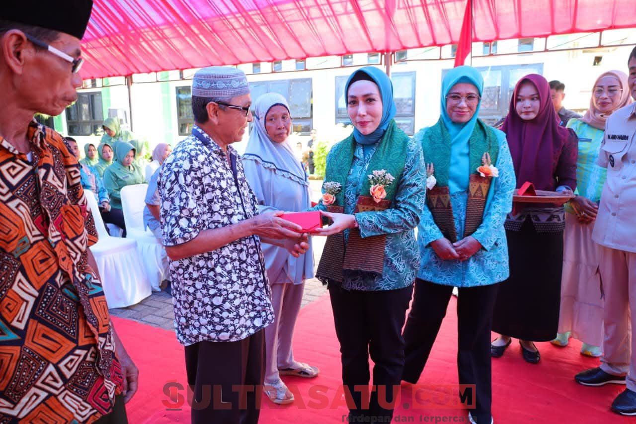Ketua TP-PKK Konawe Utara, Hj. Wisra Wastawati Ikbar, menyerahkan bantuan kaca mata untuk lansia di Konut.